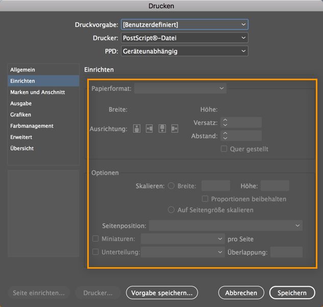 Beim Drucken eines InDesign-Dokuments als PostScript-Datei sind die Optionen zum Anpassen der Seite deaktiviert.