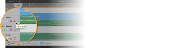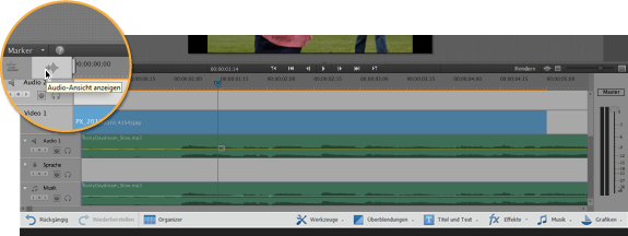 In der Audio-Ansicht werden alle Audiospuren erweitert angezeigt, während die Videospuren reduziert werden. Somit können Sie sich leichter auf das Bearbeiten der Audiospuren konzentrieren, während das Schnittfenster unverändert bestehen bleibt.