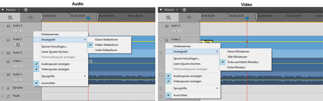 Hinweis: Standardmäßig werden Audiospuren als Halbe Wellenform angezeigt, während Videospuren als Erste und letzte Miniatur angezeigt werden.
