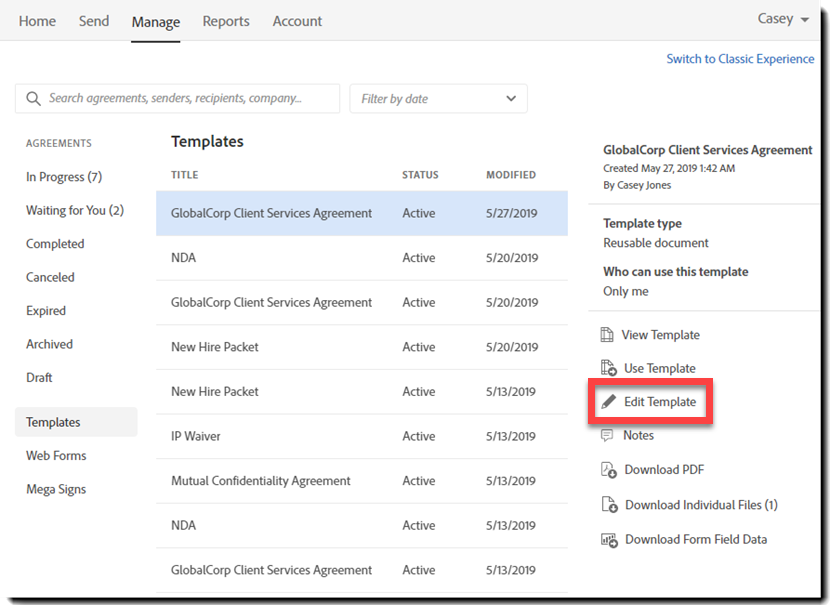 1. Klicken Sie auf der Seite „Verwalten“ auf Vorlage bearbeiten.