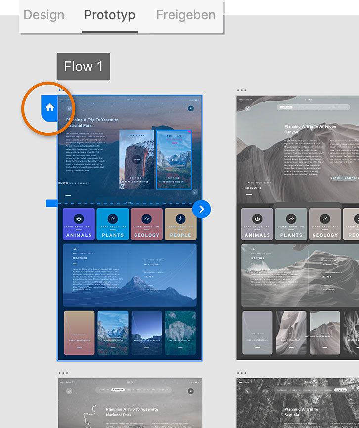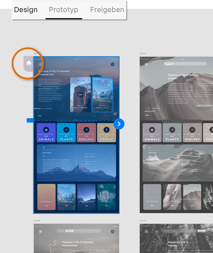 Klicken Sie auf das Startsymbol. Es wird blau hinterlegt, um anzuzeigen, dass diese Zeichenfläche als Startseite eingerichtet wurde. Zeichenfläche kann als Startseite festgelegt werden Zeichenfläche kann als Startseite festgelegt werden Startseite ist festgelegt Startseite ist festgelegt Um eine andere Zeichenfläche als Startseite zu definieren, klicken Sie einfach auf das Startsymbol der betreffenden Zeichenfläche. Um nach dem Veröffentlichen alle Zeichenflächen zu sehen, müssen alle betreffenden Zeichenflächen verknüpft sein.