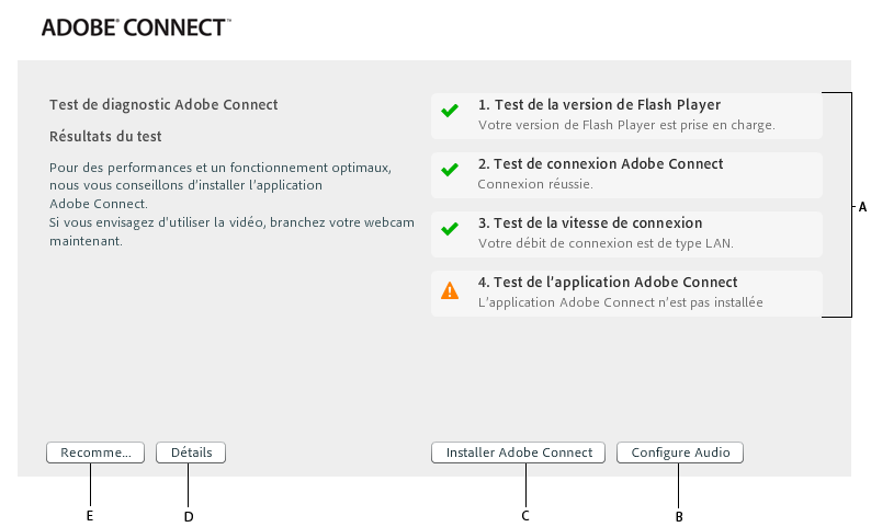Résultats du test de réunion si Adobe Connect et Flash Player ne sont pas installés