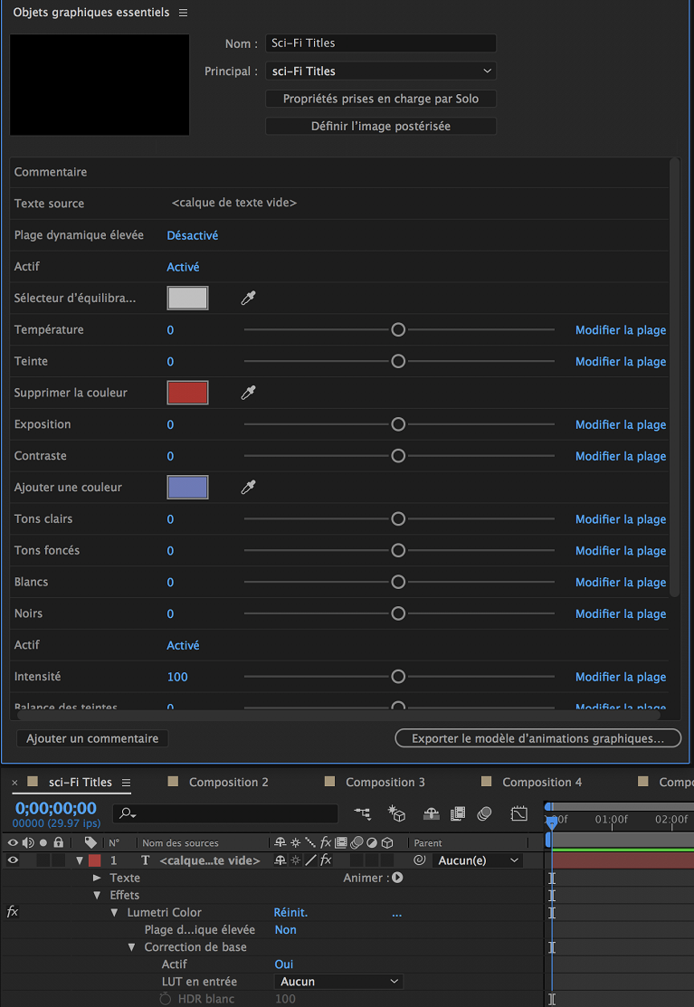 Lorsque vous dupliquez une composition dans le panneau Projet (Commande + D sous macOS ou Ctrl + D sous Windows), After Effects duplique les propriétés et les commentaires ajoutés au panneau Objets graphiques essentiels de cette composition.