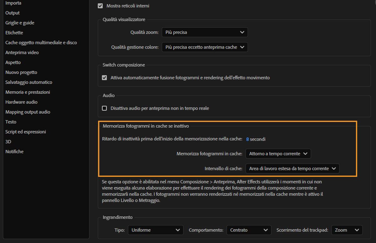 • Zone de travail : After Effects met en cache toutes les images de la zone de travail.