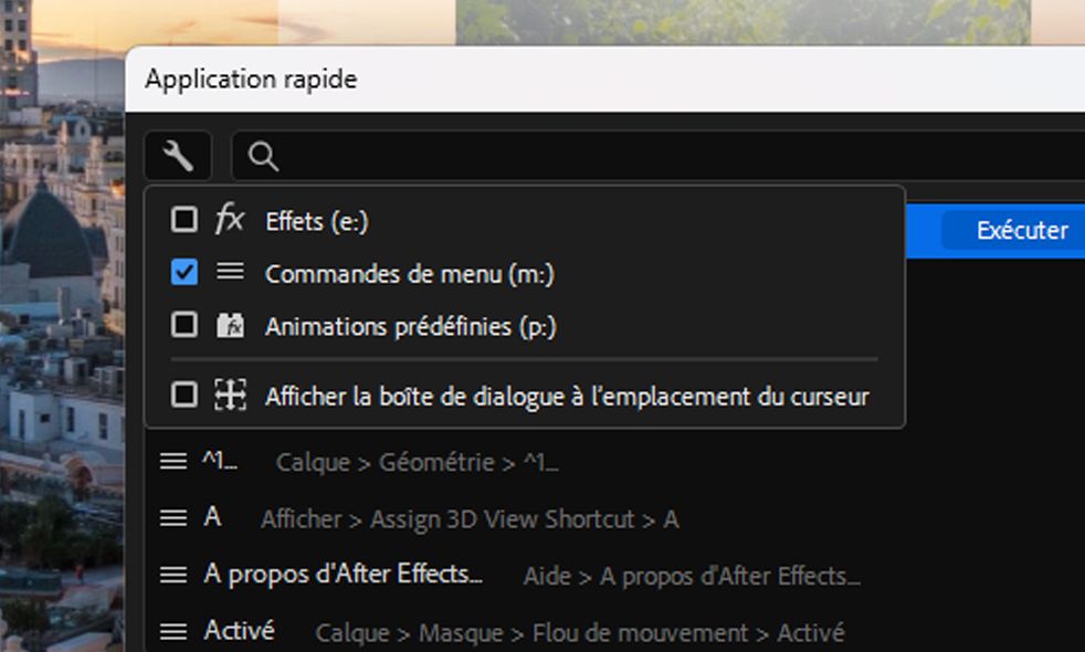 Recherchez et exécutez n'importe quelle commande de menu de niveau supérieur, y compris les modes de fusion, les scripts installés et les Préférences.