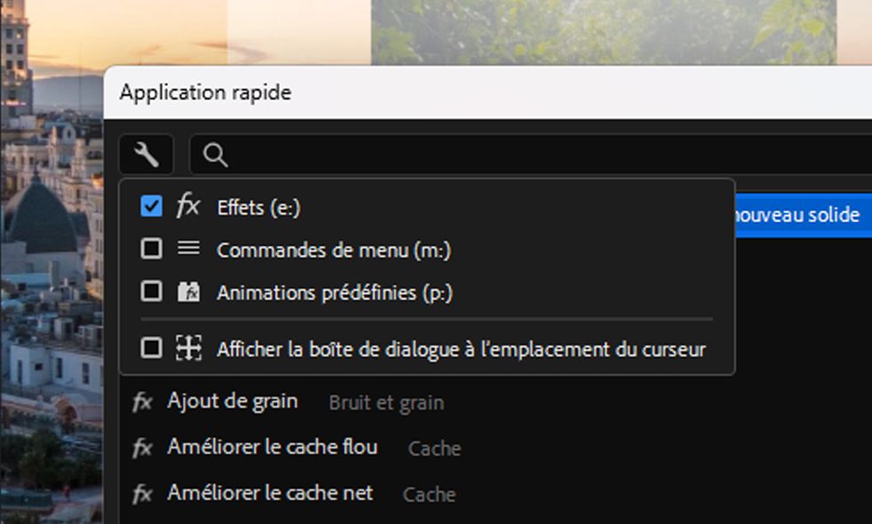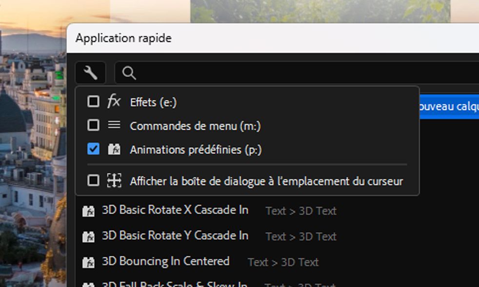 Découvrez comment utiliser l'Application rapide pour rechercher et appliquer instantanément n'importe quel effet, animation prédéfinie ou commande de menu dans After Effects.