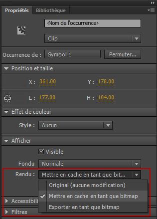 Pour activer la propriété Cache en tant que bitmap pour un symbole de clip, sélectionnez l’instance de clip et sélectionnez Cache en tant que bitmap dans le menu déroulant Inspecteur de propriétés (Fenêtre > Propriétés).