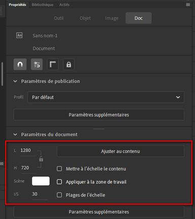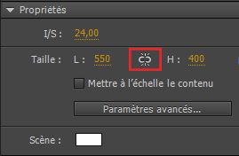 L’inspecteur des propriétés et la boîte de dialogue Paramètres du document proposent une option Lien qui permet d’augmenter les dimensions de la scène de manière proportionnelle. Par défaut, les propriétés de hauteur et de largeur de la scène sont dissociées. Lorsque vous cliquez sur le bouton Lien et activez la liaison, si vous modifiez les valeurs des propriétés de hauteur ou de largeur, la valeur de l’autre propriété est modifiée de manière proportionnelle.