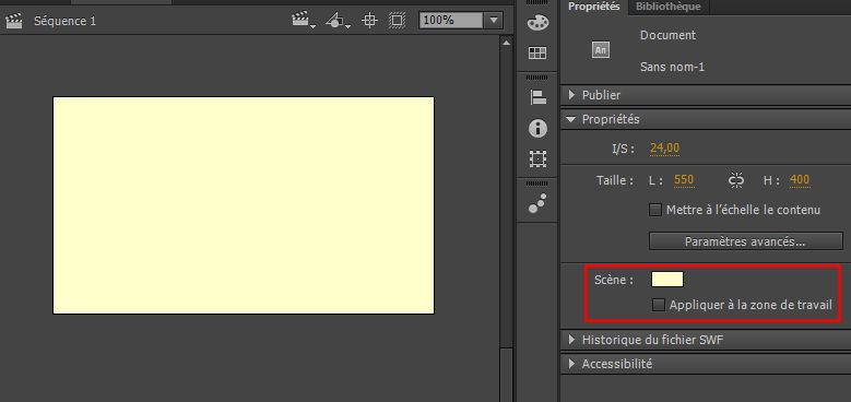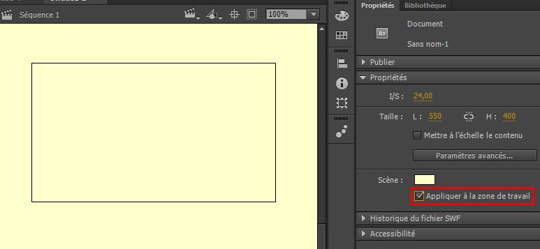 Vous pouvez définir la zone de travail en mode transparent en sélectionnant les plages de couleur alpha en pourcentage dans vos nuanciers. Pour cela, sélectionnez la zone de travail > Propriétés > Scène > % alpha.