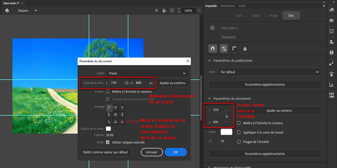 Mise à l’échelle d’une scène sur la base de l’ancre sélectionnée