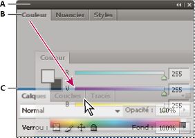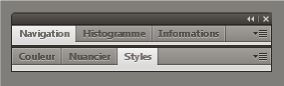 Pour réduire ou agrandir un panneau, un groupe de panneaux ou une pile de panneaux, cliquez deux fois sur un onglet. Vous pouvez également double-cliquer sur la zone d’onglets (l’espace vide situé à côté des onglets).