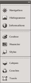 Vous pouvez réduire des panneaux à la taille d’icônes afin de limiter l’encombrement de l’espace de travail. Dans certains cas, les panneaux sont réduits de la sorte dans l’espace de travail par défaut.