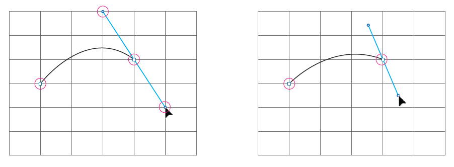Dans les versions précédentes d’Illustrator CC, lors du dessin d’un point d’inflexion avec l’outil Plume également, les poignées opposées avaient la même longueur et étaient couplées.