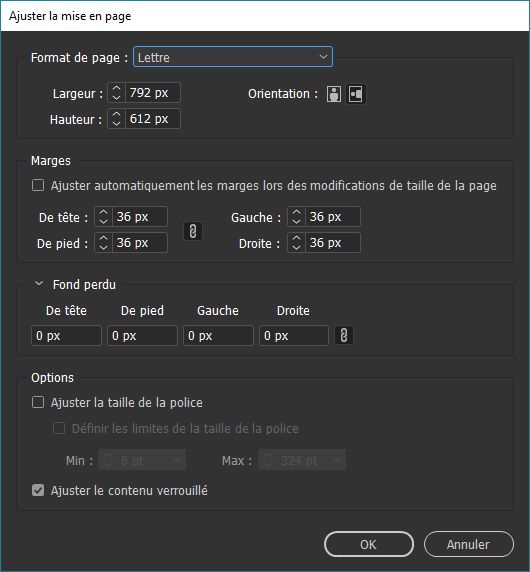 Dans la boîte de dialogue Ajuster la mise en page, indiquez les options suivantes :