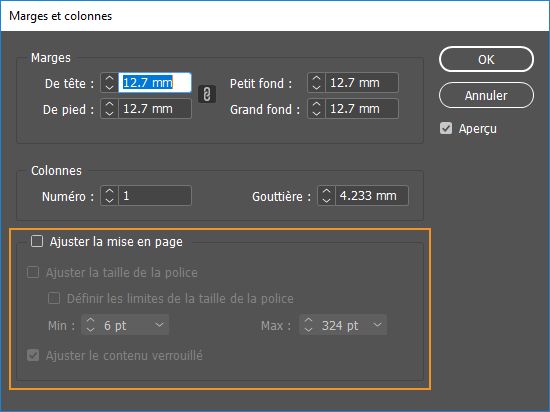 Dans la boîte de dialogue Marges et colonnes, sélectionnez Ajuster la mise en page. Par défaut, cette case n’est pas cochée.