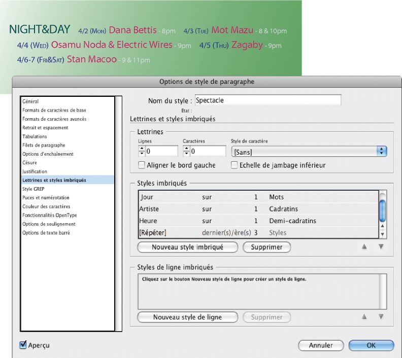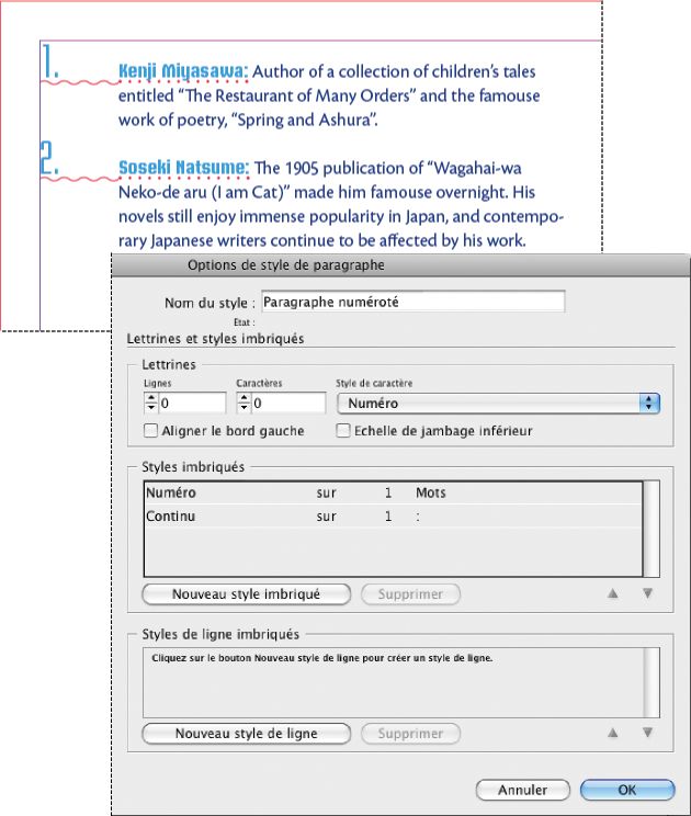 Remarque :pour un résultat optimal, appliquez les styles imbriqués dans le cadre des styles de paragraphe. Si vous appliquez des styles imbriqués comme remplacements locaux dans un paragraphe, toute modification ultérieure apportée au style imbriqué risque d’engendrer une mise en forme inattendue des caractères du texte.