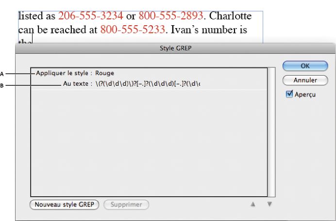 GREP est une technique de recherche avancée basée sur des motifs. Vous pouvez utiliser les styles GREP pour appliquer un style de caractère au texte respectant l’expression GREP spécifiée. Par exemple, vous voulez appliquer un style de caractère à tous les numéros de téléphone du texte. Lorsque vous créez un style GREP, vous devez sélectionner le style de caractère et spécifier l’expression GREP. Le style de caractère est appliqué à l’ensemble du texte du paragraphe correspondant à l’expression GREP.