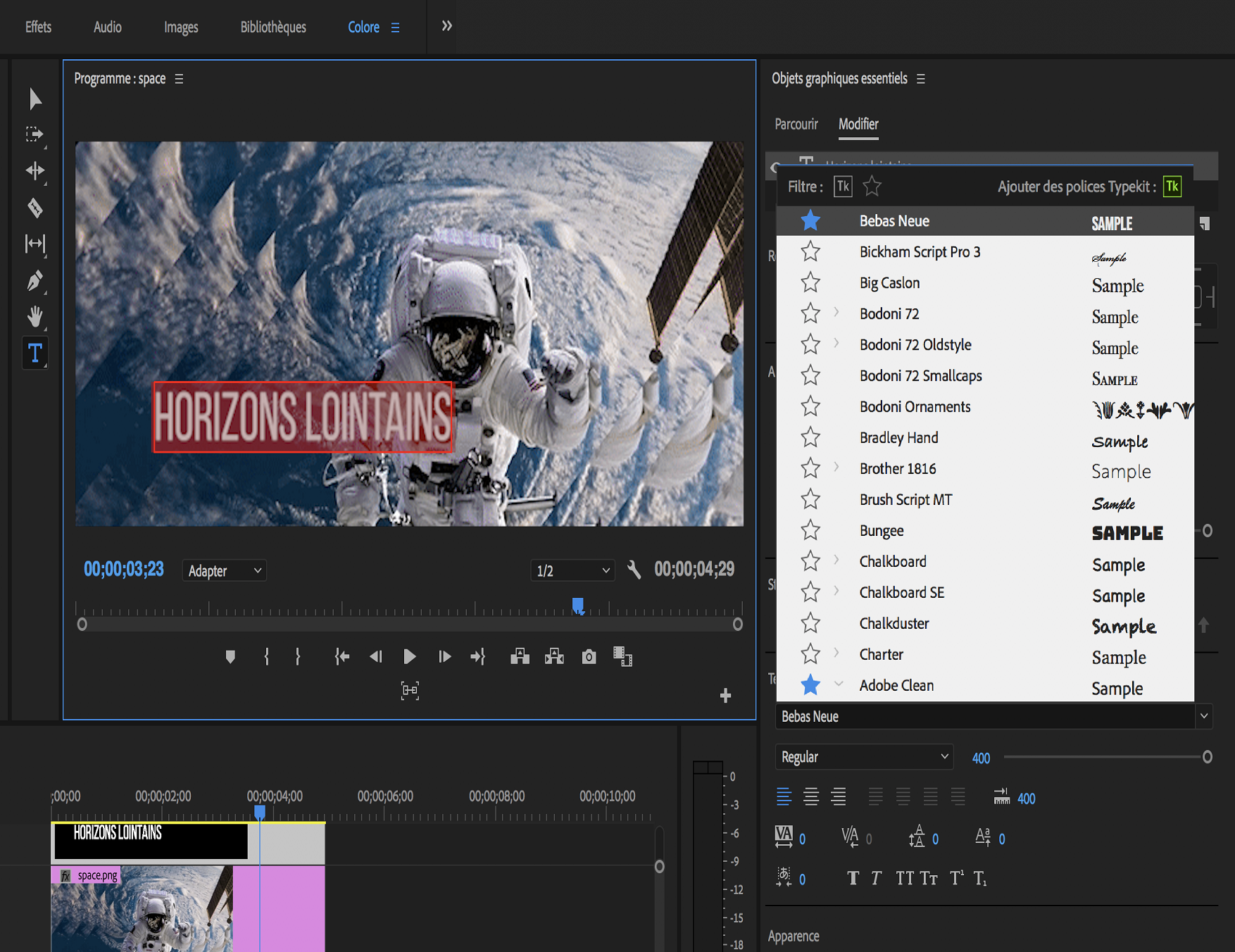 À partir de la version 25.0 de Premiere Pro, l’application ne comprend plus le panneau Objets graphiques essentiels. Vous pouvez désormais modifier plus efficacement les titres, les légendes, l’audio, les vidéos et les graphiques dans le nouveau panneau Propriétés et parcourir les animations graphiques et les fichiers audio Stock dans le panneau Animations graphiques.