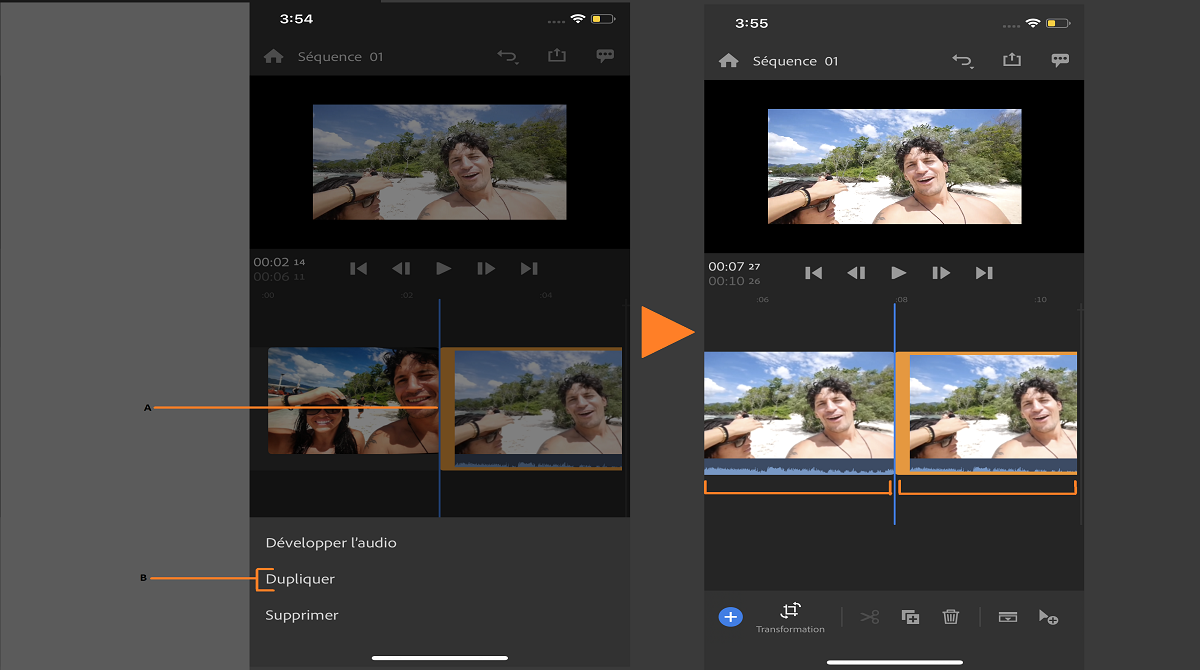 1. Appuyez sur l’élément vidéo (qui inclut les données audio) sur le montage.