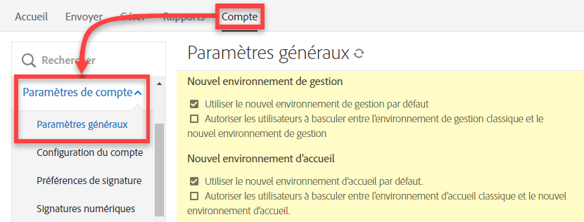 Environnements disponibles : Sandbox, Commercial, Administration | Niveaux de service disponibles : Acrobat Sign Solutions | Portée de la configuration : Compte et groupe ; Activé par défaut.