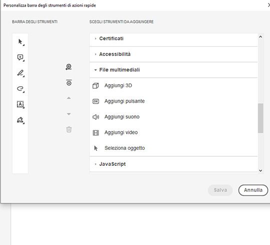 Viene visualizzata la finestra di dialogo Personalizza barra degli strumenti di azioni rapide.