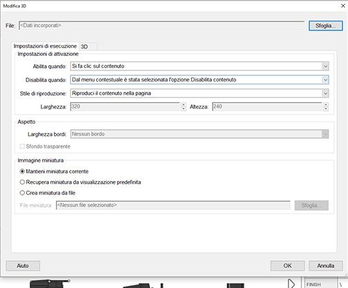 Specifica il file JavaScript da eseguire se è abilitato un modello 3D. Seleziona l’opzione Sfoglia per aggiungere un file JavaScript al PDF.