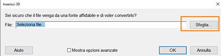 Nella finestra di dialogo Inserisci 3D, utilizza l’opzione Sfoglia per selezionare il file 3D.