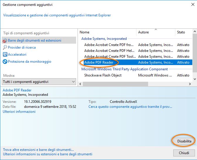 Selezionare Adobe PDF Reader e fare clic sul pulsante Attiva o Disabilita. Selezionare Adobe PDF Reader e fare clic sul pulsante Attiva o Disabilita. Per ulteriori informazioni, vedere l’argomento della Guida di Internet Explorer sulla gestione dei componenti aggiuntivi in Internet Explorer.