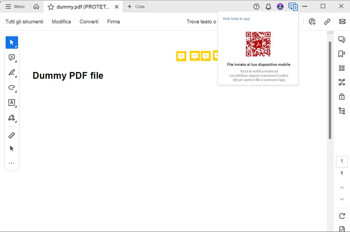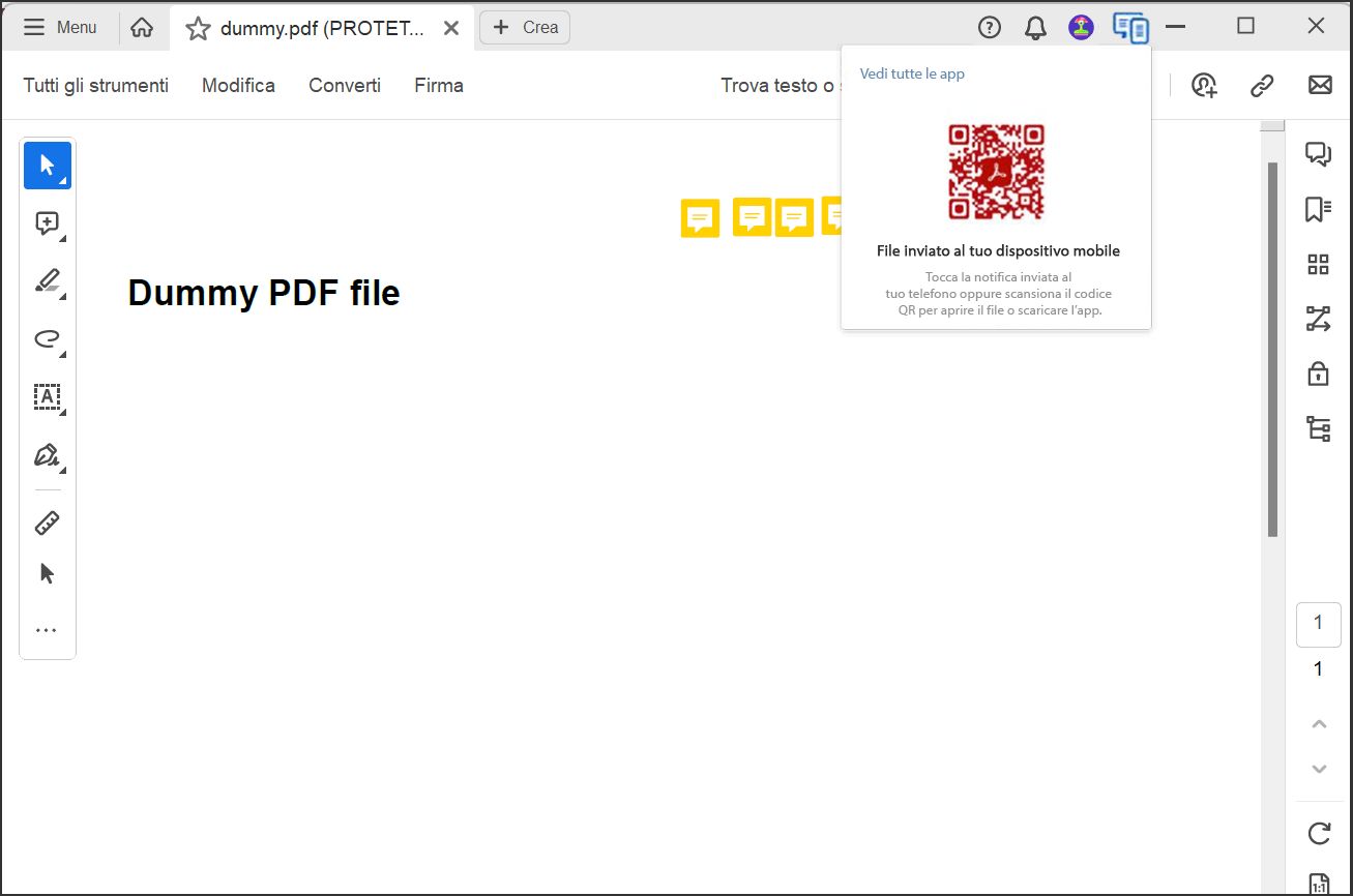 Nella versione precedente, Acrobat per desktop forniva un codice QR per installare l’app per dispositivi mobili e leggere i file PDF sul telefono. Tuttavia, la versione più recente invia una notifica di lettura dei file PDF sul tuo dispositivo mobile senza la necessità di un codice QR.