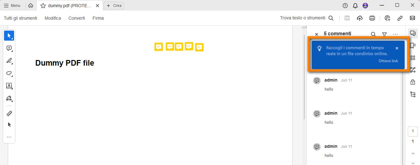 Inoltre, se si apre un file PDF e si aggiungono commenti offline, Acrobat ti richiede di selezionare Ottieni collegamento per caricare il file online e condividerlo con altri destinatari.