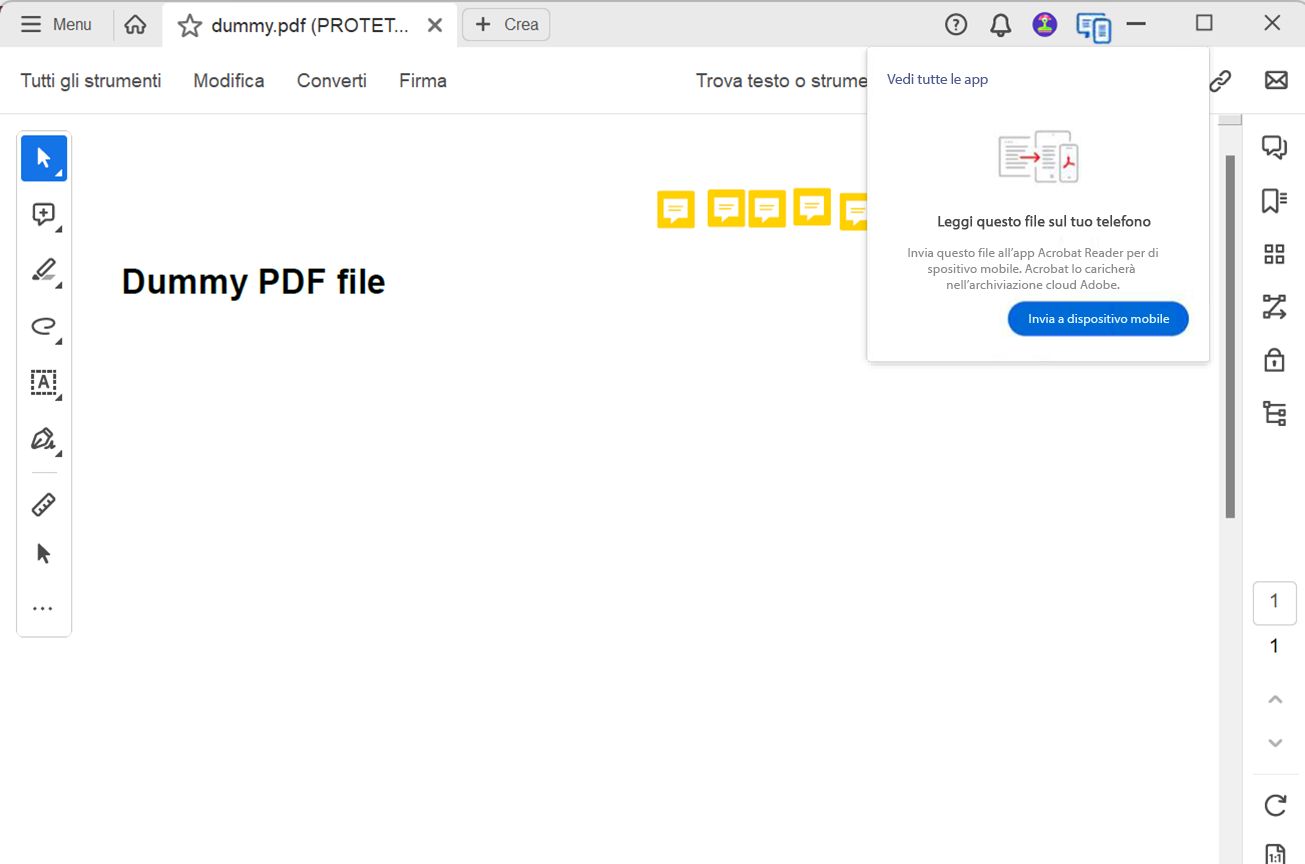 Quando apri un file PDF salvato sul desktop, Acrobat ti invita a caricare il file sull’archiviazione cloud di Adobe per poterlo leggere su dispositivi mobili. Seleziona Invia a dispositivo mobile per continuare a caricare il file PDF nell’archiviazione cloud di Adobe.