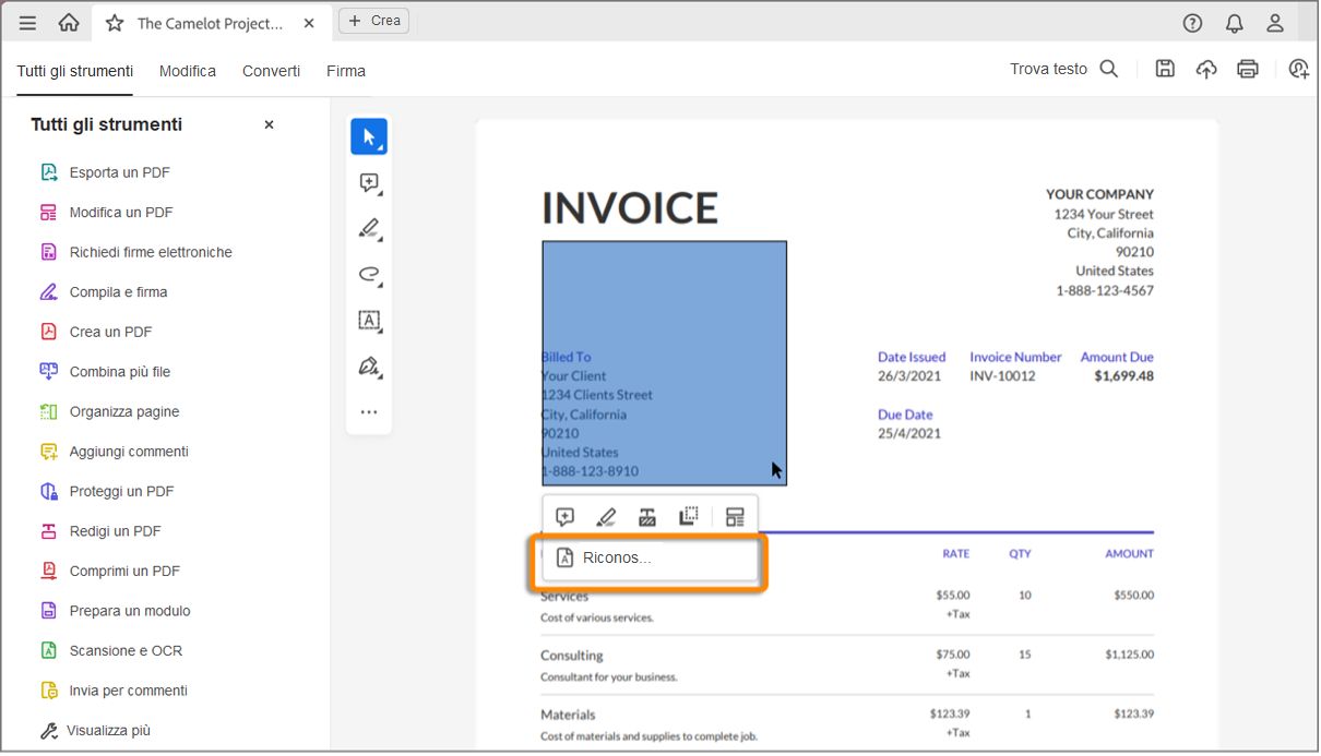 In Acrobat è ora disponibile l’opzione Riconosci testo in un documento acquisito da scanner dal menu di scelta rapida del tasto destro del mouse.