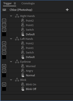 I trigger sono creati per controllare il modo in cui i gruppi e i livelli vengono visualizzati o nascosti quando si preme un tasto. Puoi creare una gamma diversificata di trigger, comprese le posizioni delle mani, palle di fuoco in loop e cicli di battiti delle palpebre per controllare i pupazzi.