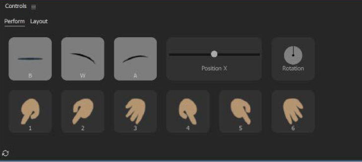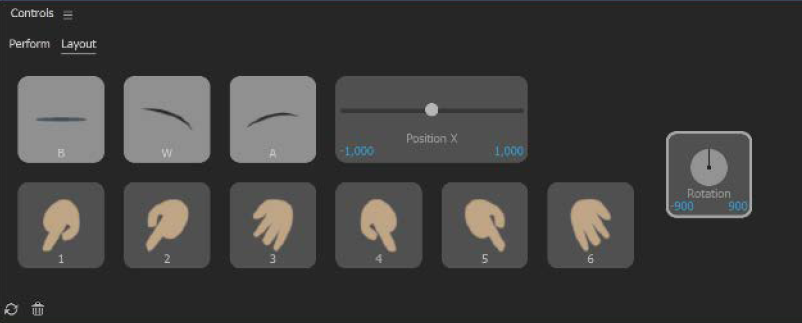 Il pannello Controlli fornisce un’interfaccia visiva, o dashboard, che consente di accedere ai trigger o ai parametri di comportamento supportati per un pupazzo. Puoi scegliere i trigger e i parametri di comportamento (valori numerici e angolari) a cui desideri accedere, e quindi controllarli da una singola posizione. Questi controlli personalizzati vengono associati al pupazzo e possono essere condivisi con altri nell’ambito di un pupazzo esportato.
