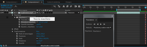 Se il pannello Tracciatore non è visualizzato, selezionate una maschera e andate su Animazione > Traccia maschera per visualizzare il pannello. Potete anche fare clic context su una maschera e scegliere Traccia maschera dal menu di scelta rapida.