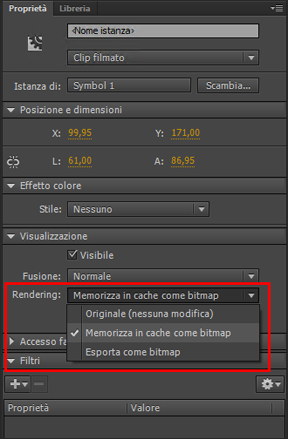 Per abilitare la proprietà Memorizza in cache come bitmap per un simbolo di clip filmato, selezionate l'istanza di clip filmato, quindi selezionate Memorizza in cache come bitmap dal menu a discesa Rendering della finestra di ispezione Proprietà (Finestra > Proprietà).