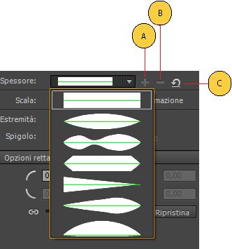L’opzione di salvataggio del profilo di spessore è abilitata solo se sullo stage è selezionato uno spessore variabile diverso dai profili di spessore predefiniti. Potete creare profili di tratto personalizzati con lo strumento Spessore e quindi salvarli. Analogamente, l’icona di eliminazione profilo di spessore è abilitata quando nel menu a discesa è selezionato un profilo di spessore personalizzato. Potete usare questa icona per eliminare qualsiasi profilo personalizzato.