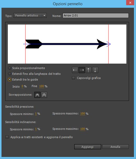 L’icona Modifica pennello apre la finestra di dialogo che consente di modificare il pennello selezionato. Se selezionate per la modifica un pennello artistico, viene visualizzata la finestra di dialogo Opzioni pennello artistico. Potete modificare proprietà quali la direzione del pennello, le preferenze di ridimensionamento e di sovrapposizione e applicare le modifiche ai tratti esistenti.