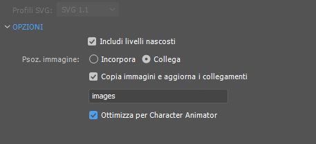 - Ottimizza per Character Animator: consente di esportare in un formato SVG adatto a Character Animator.