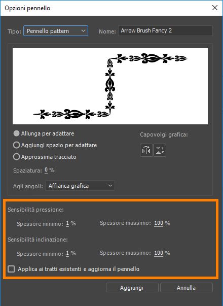 - Estendi fino alla lunghezza del tratto: per allungare il pennello in base alla lunghezza del tratto che disegnate.