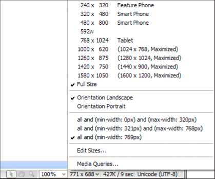 Selezionate una delle opzioni visualizzate nel menu a comparsa Dimensioni finestra situato nella parte inferiore della finestra del documento. Dreamweaver CS5.5 e versioni successive offrono un elenco esteso di scelte, comprese le opzioni specifiche per i più diffusi dispositivi mobili (come descritto di seguito).