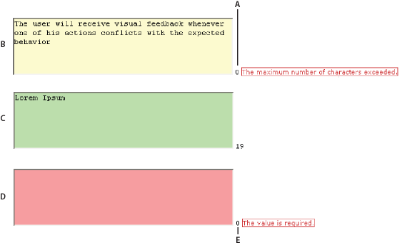 A. Contatore dei caratteri rimanenti B. Widget Area di testo attivo, stato numero massimo di caratteri C. Widget Area di testo attivo, stato valido D. Widget Area di testo attivo, stato obbligatorio E. Contatore dei caratteri inseriti