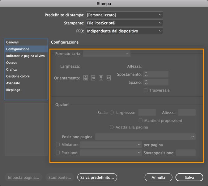 Durante la stampa di un documento InDesign come file PostScript, le opzioni per personalizzare la pagina sono disattivate.