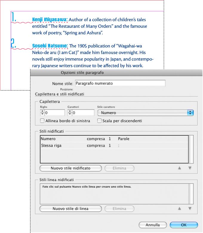 Gli stili nidificati sono particolarmente utili per i titoli incorporati a inizio frase. Ad esempio, potete applicare uno stile di carattere alla prima lettera di un paragrafo e un altro stile di carattere che ha effetto fino ai primi due punti (:). Per ogni stile nidificato, potete definire un carattere che termina lo stile, ad esempio una tabulazione o la fine di una parola.
