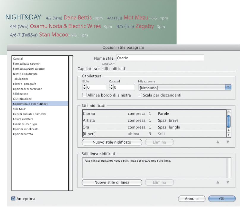 Nella sezione o nella finestra di dialogo Capilettere e stili nidificati, fate clic almeno due volte su Nuovo stile nidificato (o Nuovo stile di riga nidificato) e scegliete le impostazioni per ogni stile.