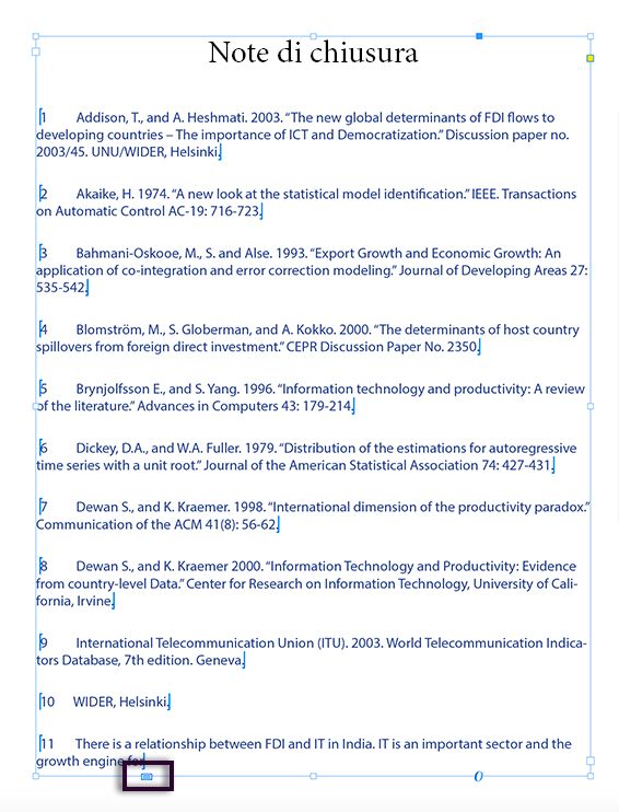 Una nota di chiusura è composta da due elementi collegati: il numero di riferimento della nota che compare nel testo e il testo della nota di chiusura inserita in una nuova cornice alla fine del documento. Nell’angolo in basso a sinistra della cornice della nota di chiusura è presente un simbolo  .