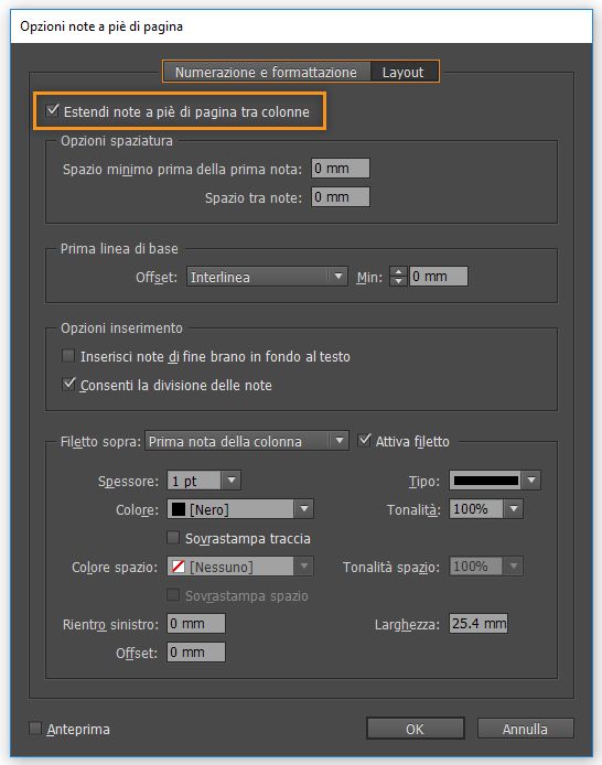 Spuntate le opzioni Attiva sostituzioni ed Estendi note a piè di pagina tra colonne.