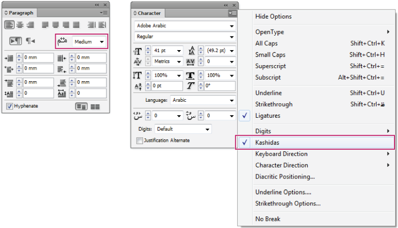 Selezionate il paragrafo e, dal pannello Paragrafo (Finestra > Testo e tabelle > Paragrafo), scegliete un’impostazione dall’elenco a discesa Inserisci Kashida. Le opzioni disponibili sono Nessuna, Breve, Media, Lunga e Stilistica. I Kashida vengono inseriti solo se il paragrafo è giustificato. Questa impostazione non è applicabile nel caso di paragrafi con impostazioni di allineamento.
