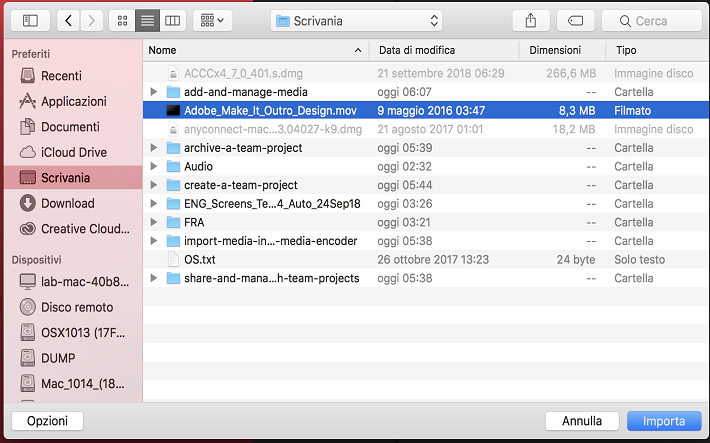 Scegli File > Importa oppure utilizza il pannello Browser multimediale. Puoi importare file multimediali da un’unità locale o di rete, da Creative Cloud, Dropbox o da una cartella Box sincronizzata con il tuo desktop.
