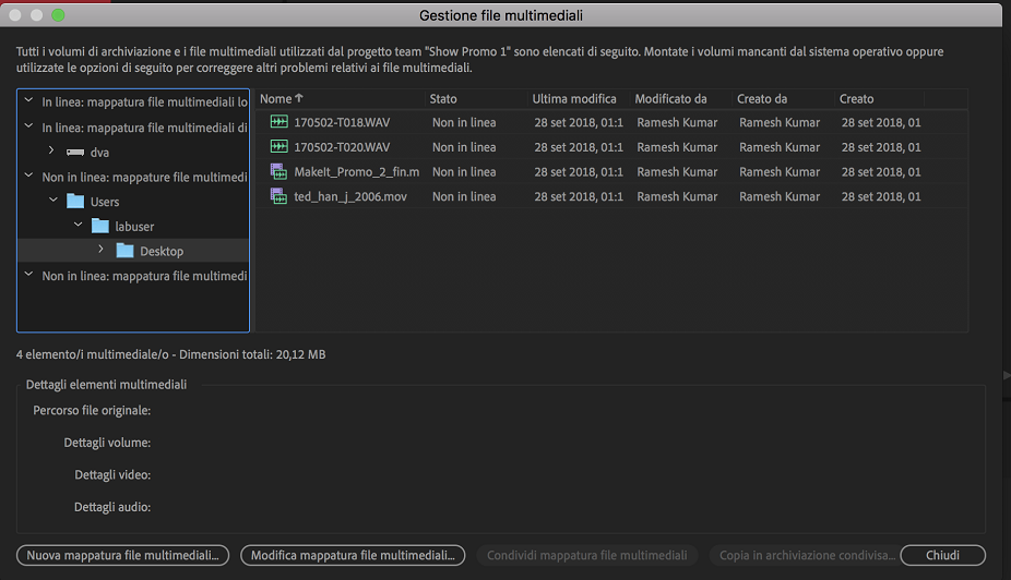 I file multimediali usati nel progetto team rimangono nel computer locale. Puoi condividere le risorse con tutto il team tramite risorse Creative Cloud, archiviazione condivisa in rete o un’altra opzione di archiviazione cloud. In caso di file multimediali mancanti, scegli Modifica > Progetto team > Gestione file multimediali dal menu principale per accedere allo strumento di gestione dei file multimediali.